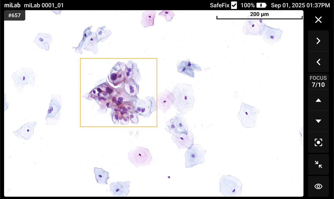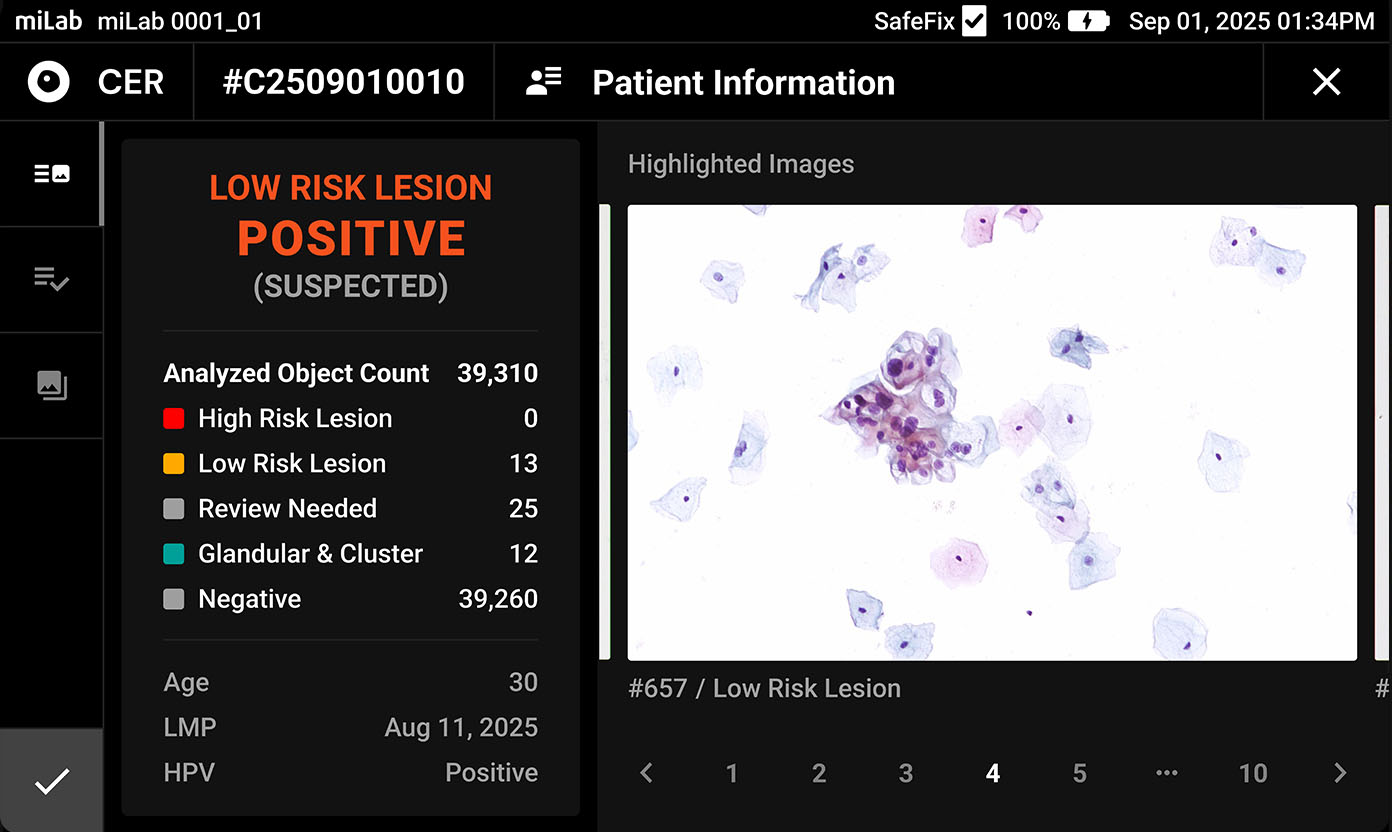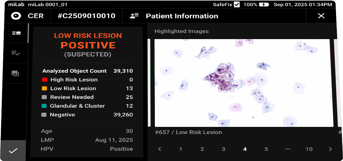 디지털 자궁경부세포분석 솔루션 miLab™ CER은, 도말된 자궁경부세포 슬라이드를 염색, 이미지 촬영, AI 분석까지 자동으로 수행하여 기존의 복잡한 검사 과정과 이에 필요한 인프라를 하나의 디바이스로 대체하였습니다. 디바이스 내에서 촬영된 자궁경부세포 이미지는 AI 알고리즘이 평균 약 25,000개의 세포를 분석하고, Bethesda 체계에 따라 분류하여 전암(pre-cancer) 및 암(cancer) 소견을 탐지합니다. 의료 전문가는 Viewer를 통해 현장 또는 원격으로 결과를 확인하고 재분류할 수 있으며, 그 결과를 바탕으로 현장 치료 또는 상급 병원 진료 연계 여부를 신속하고 정확하게 판단할 수 있습니다.